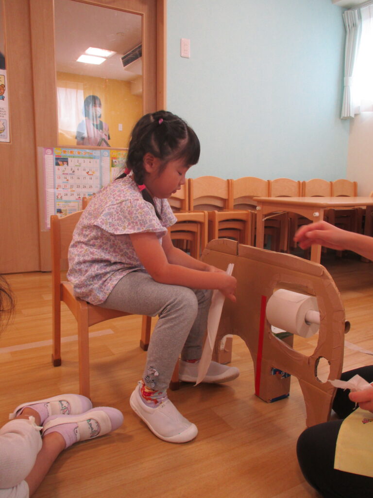 実際にトイレで使用しているペーパーホルダーの模型を用いて、一人ずつ正しい長さに切ってもらったり、排泄後の拭き方などの話を聞きました。