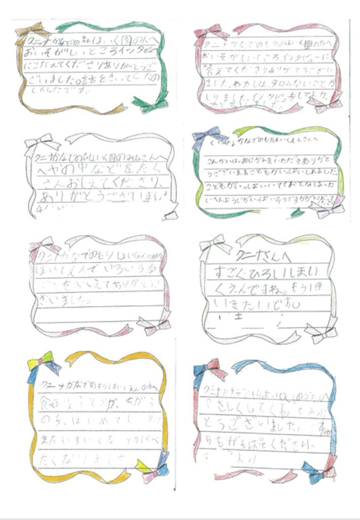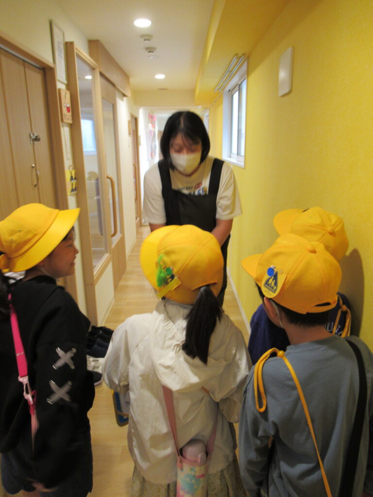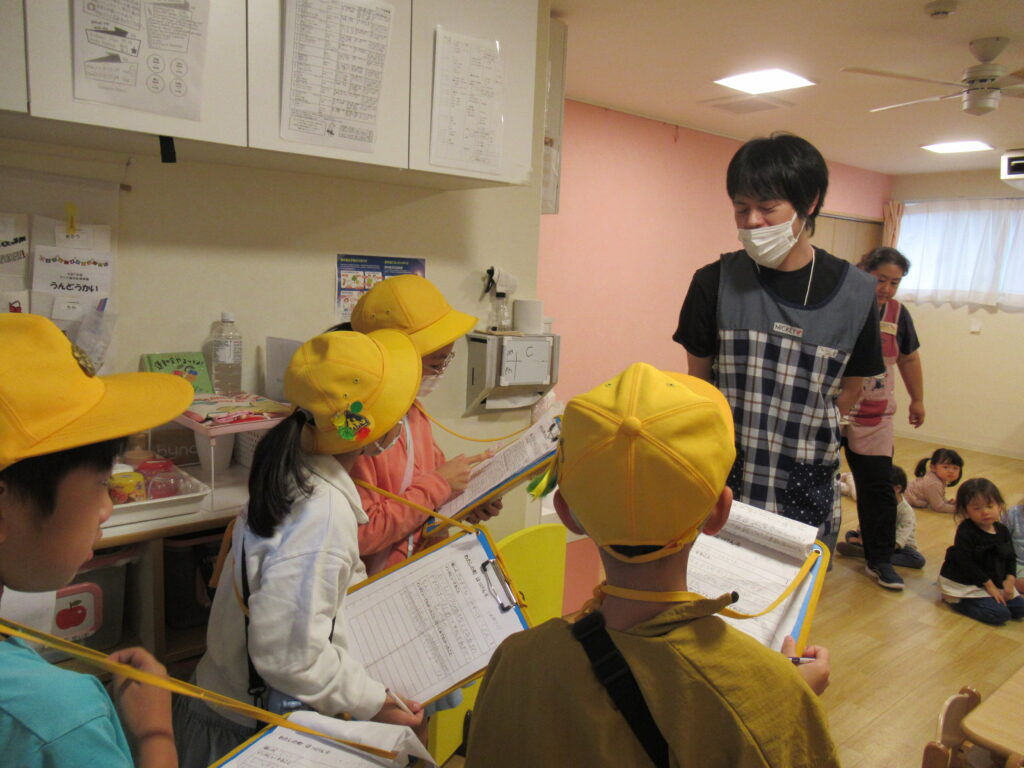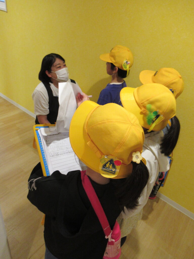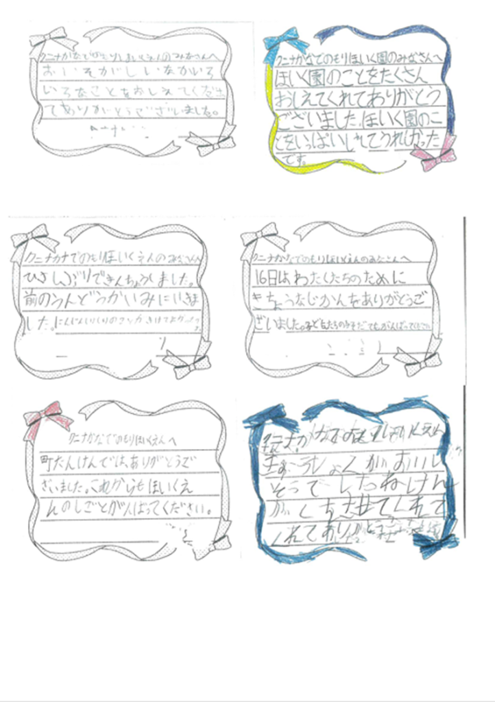 生活科「町はっけん」という学習の一環として4グループ(1グループ4~5人)で来園しました。園内を見学しながら、先生たちに色々な質問をしていました。卒園児の訪問もあり、職員も楽しいひとときを過ごすことが出来ました。後日、一人ひとりがお礼状を書いて届けてくれました。