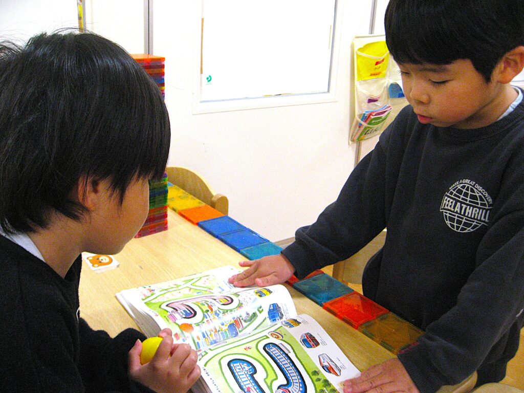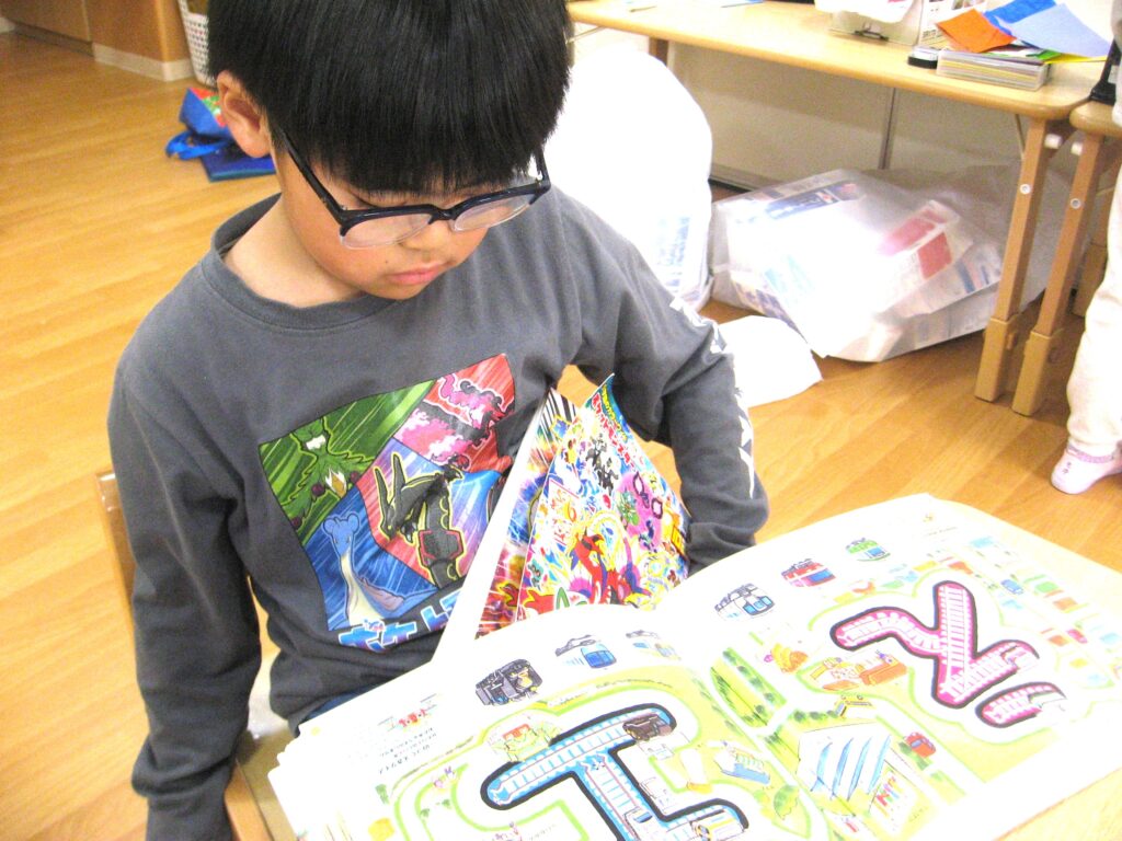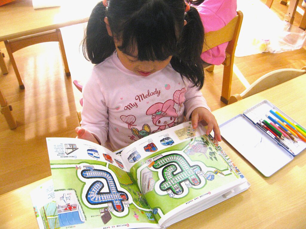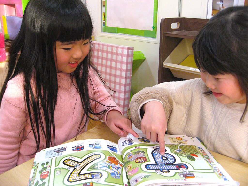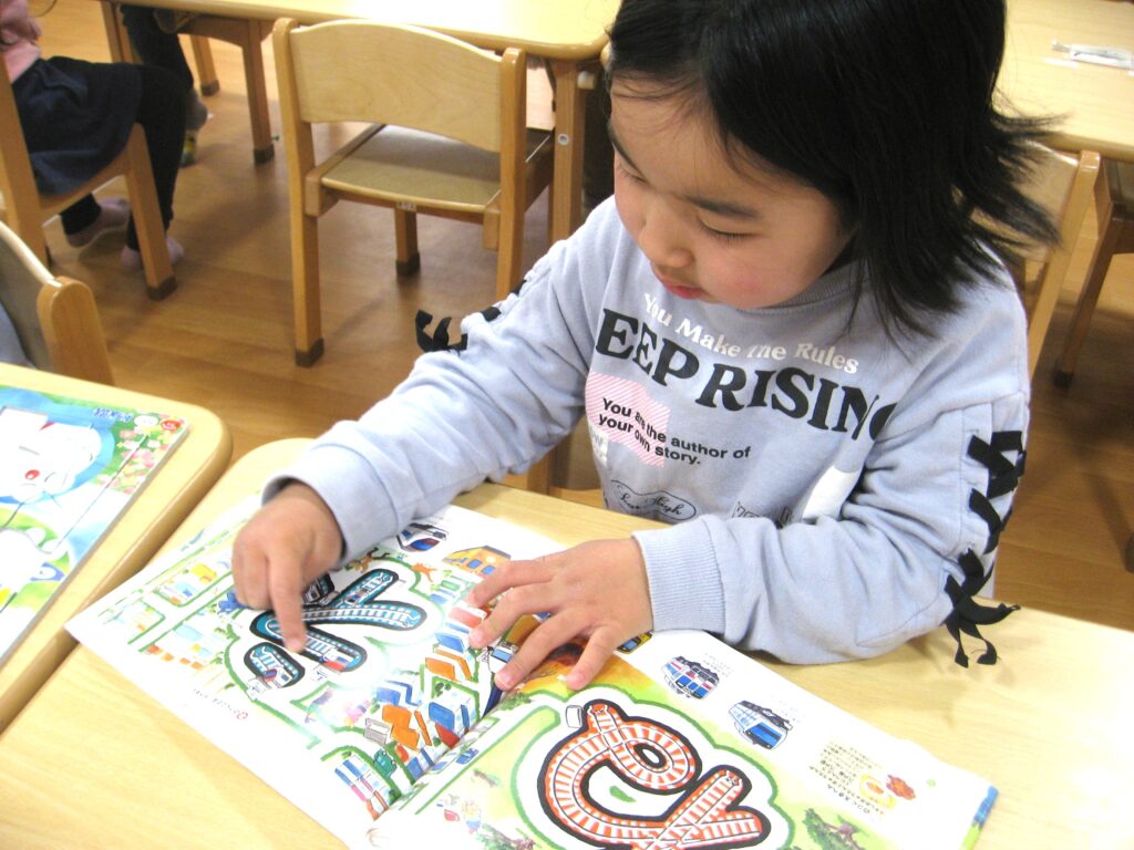 ひらがなに描かれた線路を指でなぞったり、そのひらがなの入っている絵を、おともだちと競うように探してみたりと夢中で見ていました!